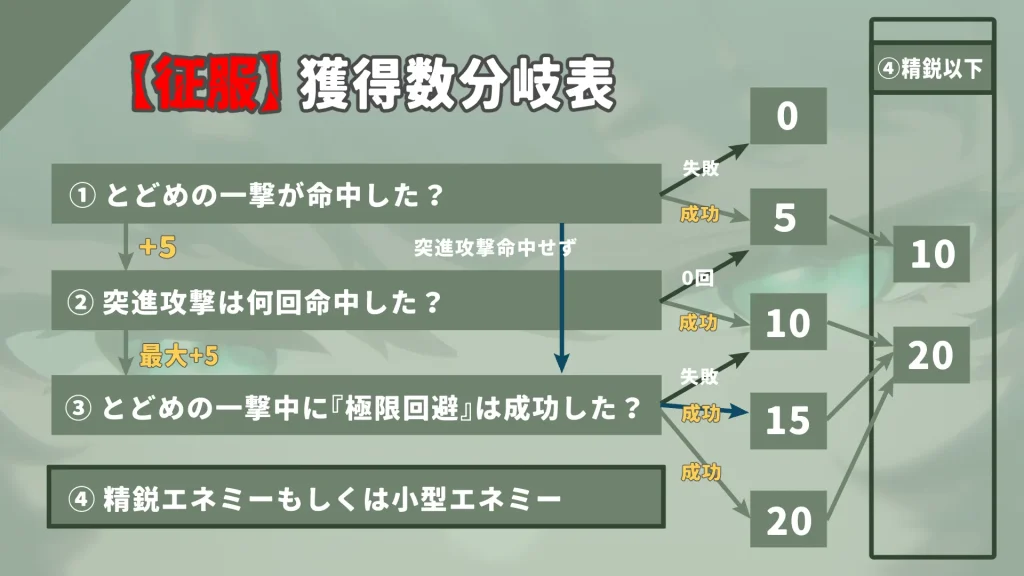 【征服】獲得数の分岐は以下の通り(もしくは上記画像)です。