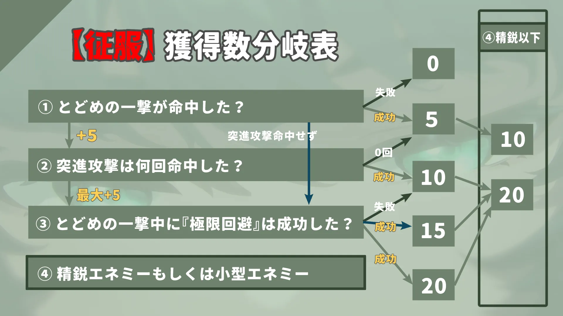 - とどめの一撃が命中したか(命中時に【征服】5重、命中しなければ全ての【征服】は付与されない)