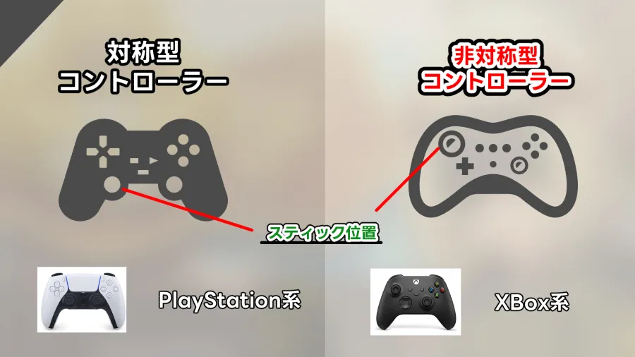 ゼンゼロではスティックが左側にある「非対称型コントローラー」がおすすめです。一般的にPS系と言われるタイプの「対象型コントローラー」に比べて移動操作がしやすい傾向があります。