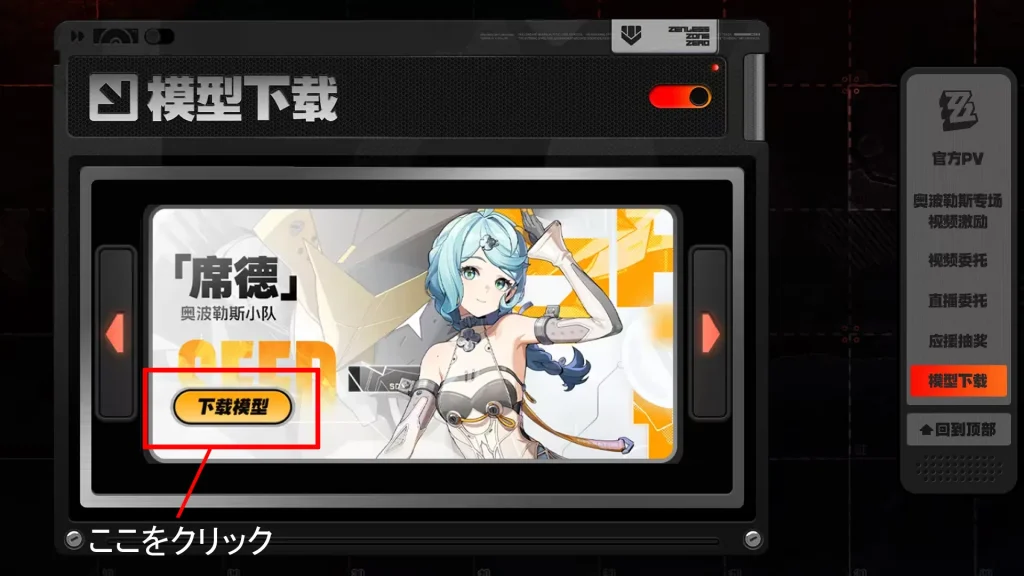 配布ページ中程にある「模型下载」から、欲しいキャラクターの「下载模型」を押すことでzipファイル形式で入手可能です。バージョンごとに管理されており、欲しいキャラの実装バージョンもしくは復刻バージョンからダウンロードすることができます。